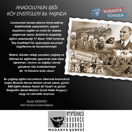 ADD Mudanya Şube Başkanı Soyer Kazancı, Köy Enstitüleri’nin 86. kuruluş yıl dönümü yayımladığı mesajında, Köy Enstitüleri’nin Cumhuriyet öncesi yıllarda ihmal edilen köylerde yaşayan vatandaşların yaşam koşullarını iyileştirmeyi hedefleyen önemli bir eğitim hamlesi olduğunu kaydetti.