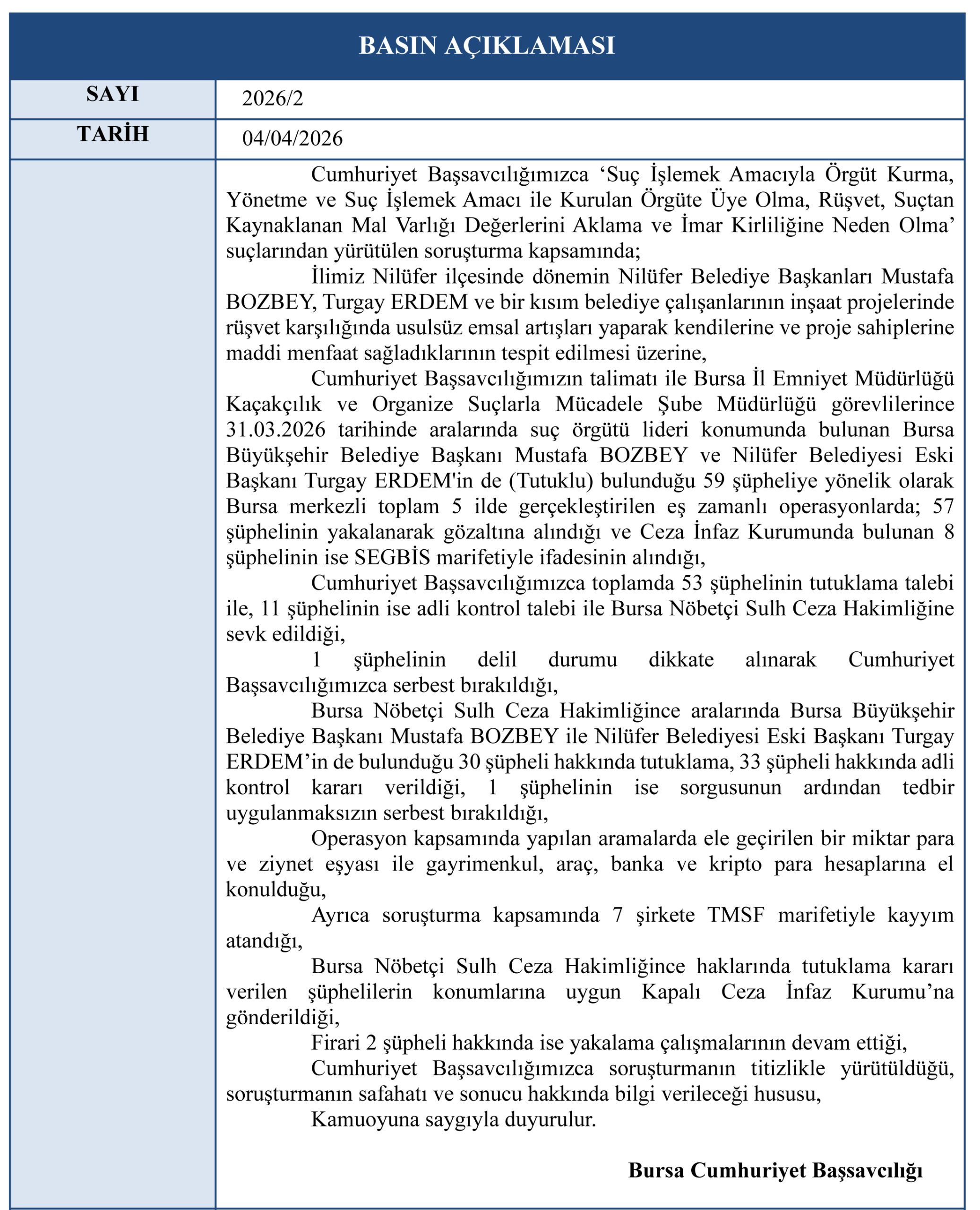 “Suç işlemek amacıyla örgüt kurma ve yönetme”, “rüşvet”, “suçtan kaynaklanan mal varlığı değerlerini aklama” ve “imar kirliliğine neden olma” suçlamaları kapsamında Bursa merkezli 5 ilde eş zamanlı operasyon düzenlendiğinin altı çizilen açıklamada, operasyon kapsamında aralarında Mustafa Bozbey ve Turgay Erdem’in de bulunduğu 59 şüpheliye yönelik işlem yapıldığı bildirild.