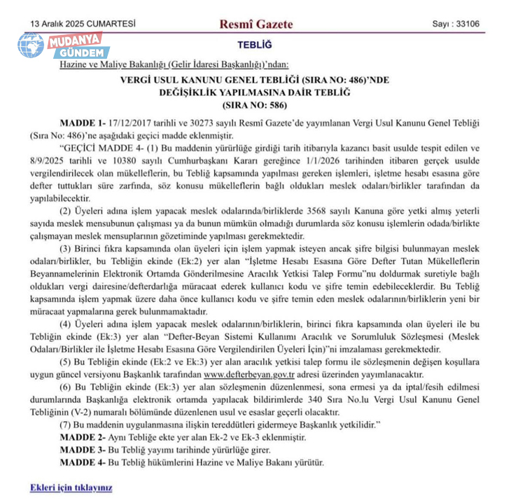 Hazine ve Maliye Bakanlığı nezdinde yürütülen girişimler sonucunda Gelir İdaresi Başkanlığı tarafından 586 Sıra No’lu Vergi Usul Kanunu Genel Tebliği ile Gerçek Usul’de vergilendirilecek Basit Usul mükelleflerinin İşletme Hesabı Esası’na göre tutacakları muhasebe defterleri ile bazı işlemlerini eskiden olduğu gibi meslek odaları ve birlikler aracılığıyla yürütüleceği ‘Resmi’leşti.