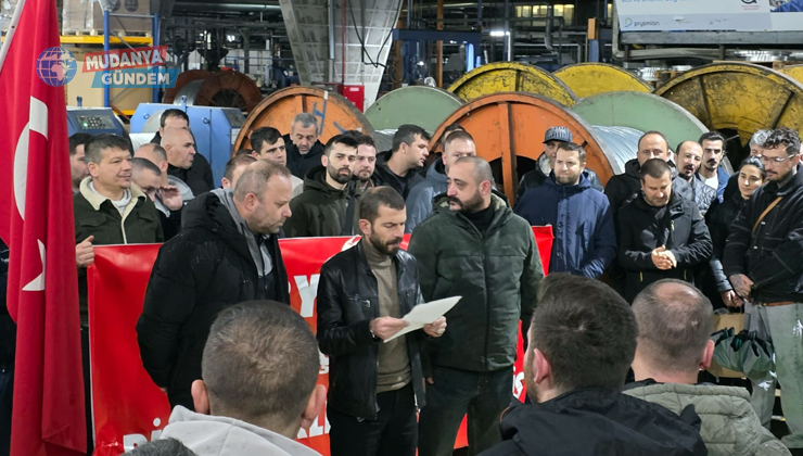 DİSK Genel Başkan Yardımcısı ve Birleşik Metal-İş Genel Başkanı Özkan Atar’ın sözleşme kapsamında örgütlü oldukları 43 fabrikada 8 Ocak 2026 Perşembe günü tüm vardiyalarda 1’er saatlik iş bırakma eylemi gerçekleştirecekleri açıklaması ardından Mudanya’da da örgütlü metal işçileri üretimi durdurdu.