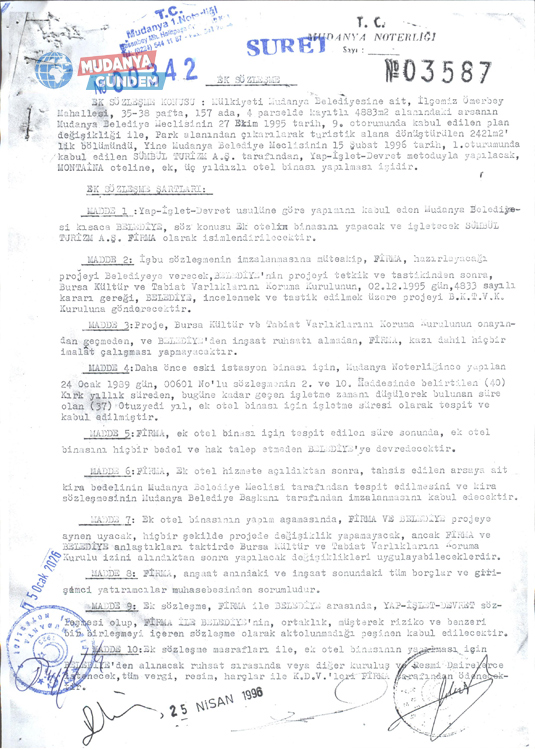 Başkan Dalgıç’ın iddia ettiği ‘helvacı kağıdı’ ile değil, 25 Nisan 1996 tarih, 3587 yevmiye nolu Mudanya Noterliği’nce düzenlenen sözleşme kapsamında kiralandığını yineleyen Urgancı, otelin ilk faaliyete geçtiği tarihten bu yana mevcut fiziki durumunda herhangi bir değişiklik olmadığını vurguladı.
