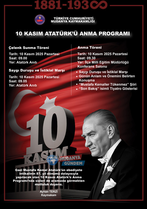 Türkiye Cumhuriyeti’nin kurucusu Gazi Mustafa Kemal Atatürk’ün ebediyete intikalinin 87. yıl dönümü dolayısıyla Mudanya Kaymakamlığı tarafından düzenlenecek anma etkinlikleri, 10 Kasım Pazartesi günü gerçekleştirilecek.